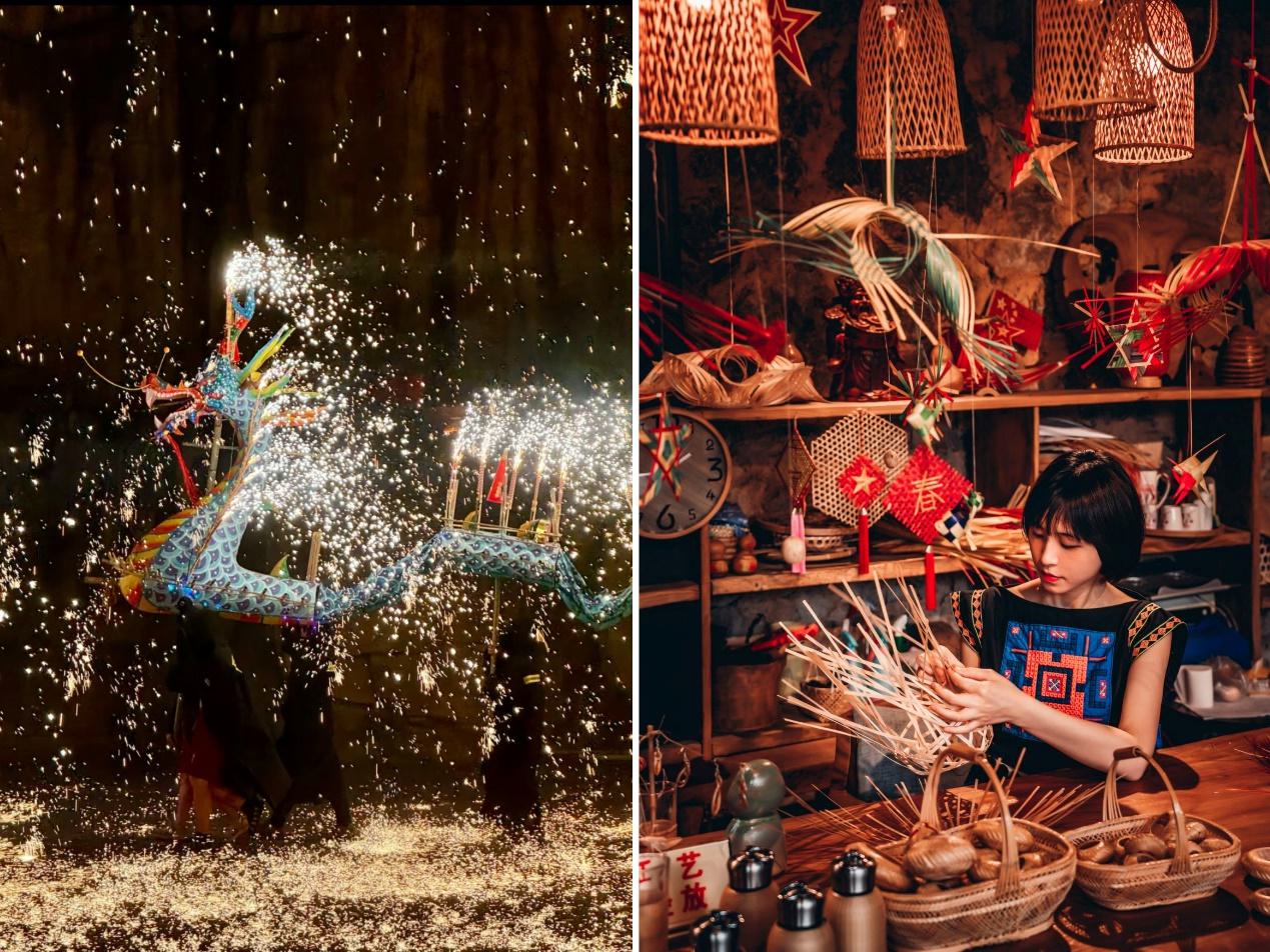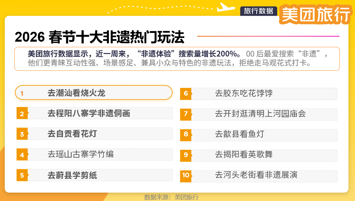 不赶热闹、不走过场。美团旅行数据显示,2026年春节“十大非遗热门玩法”为:去潮汕看烧火龙、去程阳八寨学非遗侗画、去自贡看花灯、去瑶山古寨学竹编、去蔚县学剪纸、去胶东吃花饽饽、去开封逛清明上河园庙会、去歙县看鱼灯、去揭阳看英歌舞、去河头老街看非遗展演。