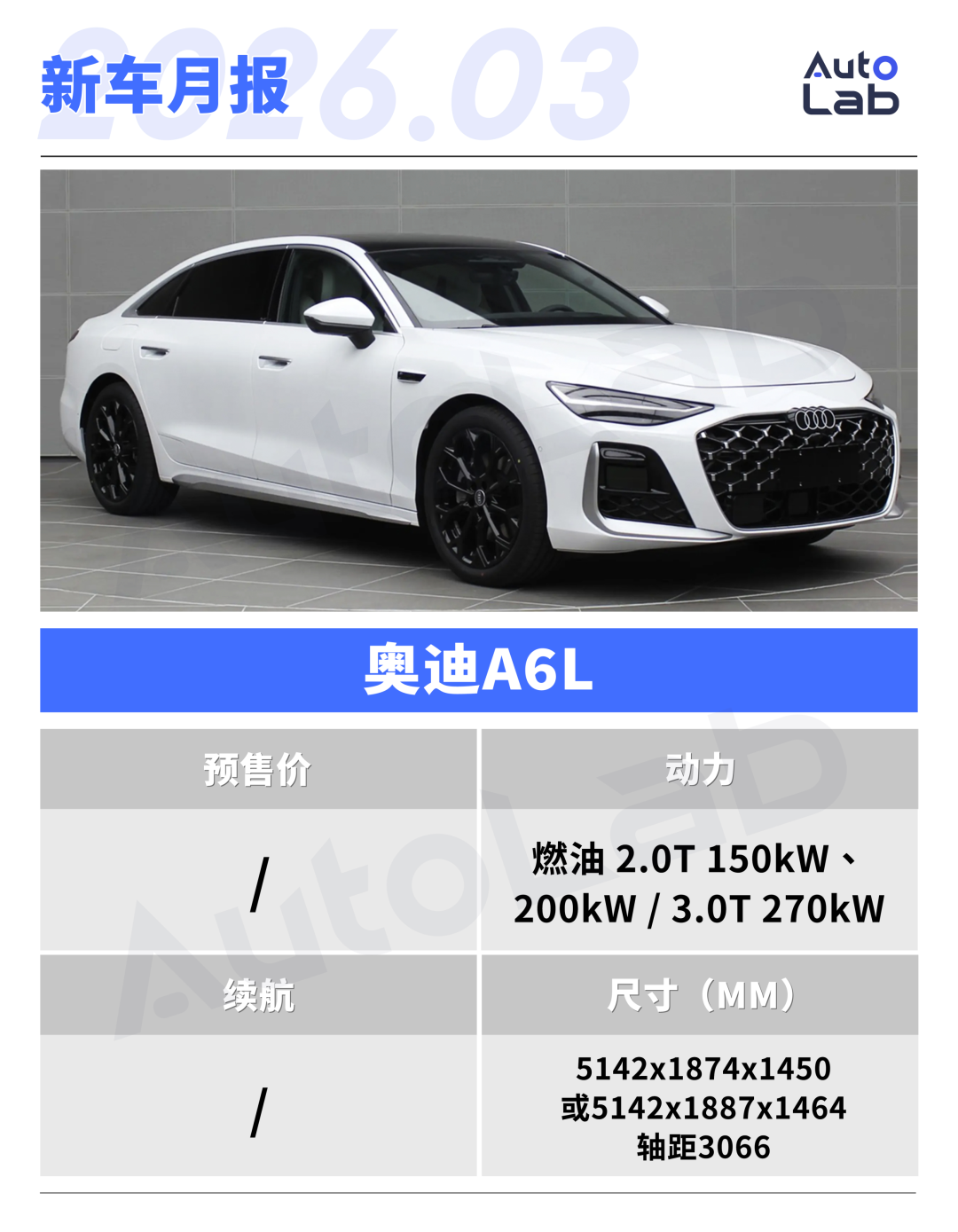 新车将基于全新的PPC平台打造,预计提供高、低功率的第五代EA888 2.0T发动机和EA839 3.0T V6发动机,并标配quattro智能四驱系统与渐进式转向系统;高配车型还将搭载华为乾崑智驾。