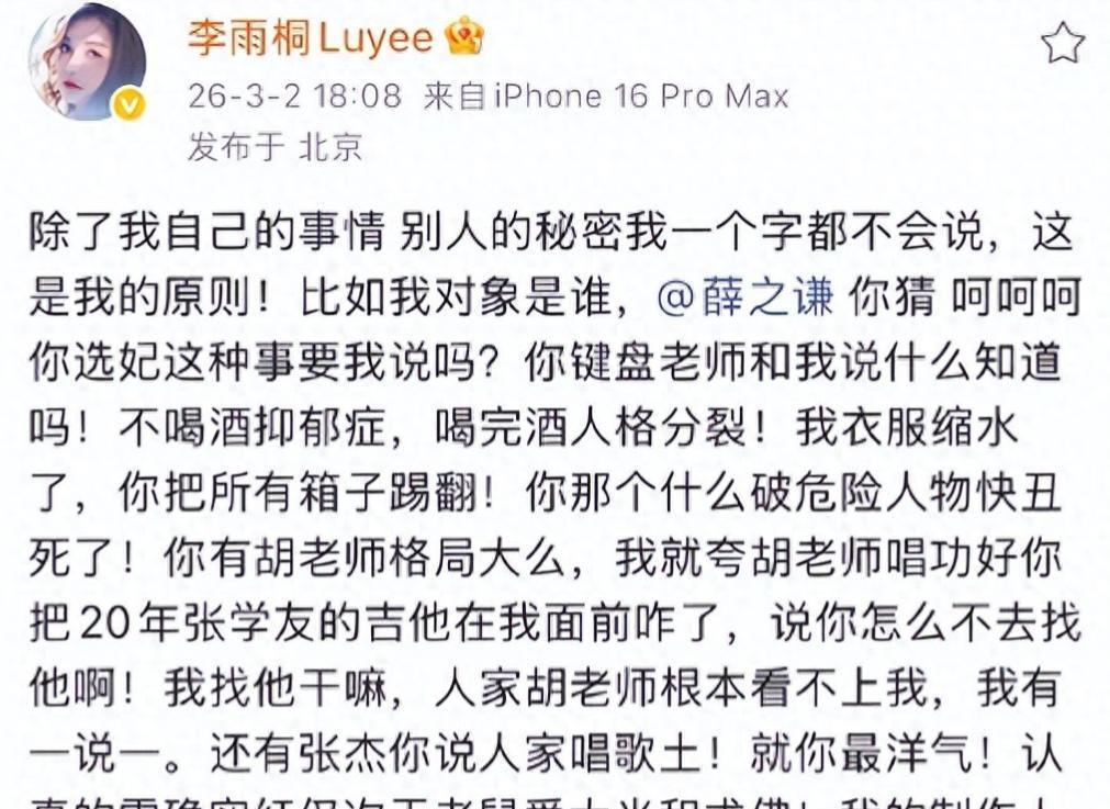 事儿还得从3月2日说起,薛之谦的前女友在网上突然开大,直接开撕,控诉起一堆问题——什么私生活乱七八糟、选妃、喝酒人格分裂,连抑郁症都被端上台面,顺带把张学友、胡彦斌、张杰都拖下水。这操作一下子把圈里圈外的人全搅进去了。普通人私下吐槽几句也就罢了,在明星这里,真是放大镜下生活,分分钟热度爆棚。