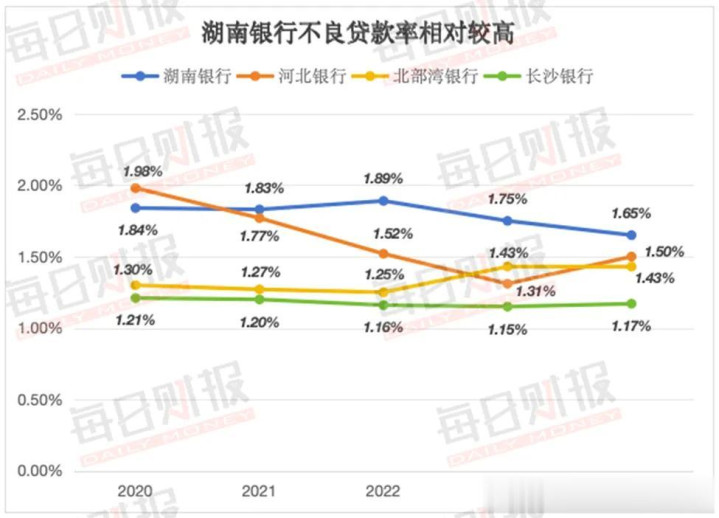 从整个金融市场不良率对比来看,湖南银行不仅远高于头部优质城商行,也高于同规模的河北银行(2024年为1.50%)、北部湾银行(2024年为1.43%),同样距离长沙银行2024年1.17%较低不良率相差较大。