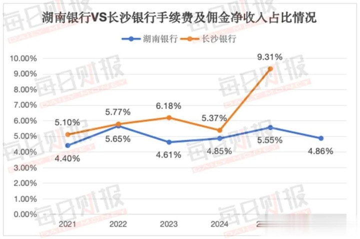 此后下滑比较剧烈,2024年和今年上半年,分别只有5.53亿元和2.72亿元,占比也已经降到了4.85%和4.86%。虽然这几年里城商行的中间业务营收占比都呈现下滑趋势,但湖南银行的占比下滑较为剧烈,已经不及头部城商行,而且与长沙银行相比,差距也在拉开。